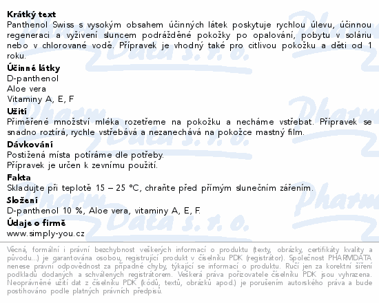Panthenol Swiss s vysokým obsahem účinných látek poskytuje rychlou úlevu, účinnou regeneraci a vyživení sluncem podrážděné pokožky po opalování, pobytu v soláriu nebo v chlorované vodě. Přípravek je vhodný také pro citlivou pokožku a děti od 1 roku.