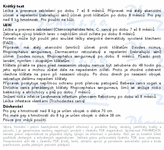 Léčba a prevence zablešení po dobu 7 až 8 měsíců. Přípravek má stálý akaricidní účinek a repelentní (zabraňující sání) účinek proti klíšťatům po dobu 8 měsíců. Pro psy nad 8 kg hmotnosti. Pro použití na kůži.