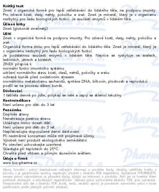 Zinek v organické formě pro lepší vstřebávání do lidského těla, na podporu imunity. Pro zdravé kosti, vlasy, nehty, pokožku a zrak. Zinek je minerál, který je v organismu nezbytný pro řadu biologických funkcí. Je součástí enzymů v lidském těle.