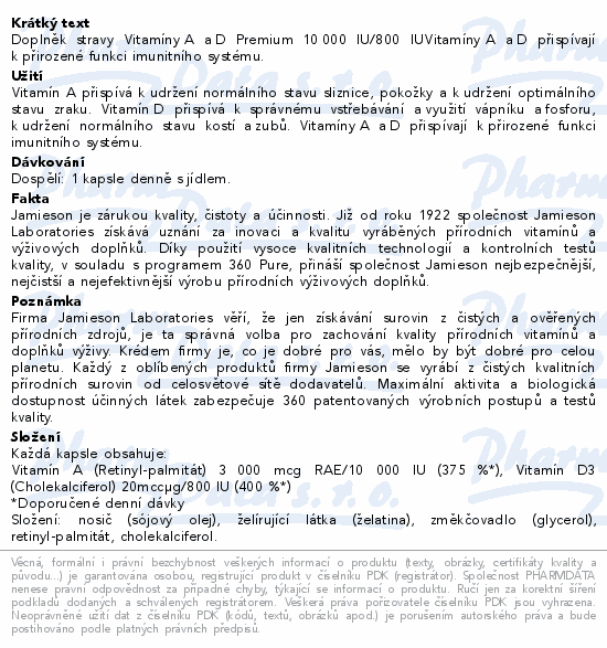Doplněk stravy Vitamíny A a D Premium 10 000 IU/800 IUVitamíny A a D přispívají k přirozené funkci imunitního systému.