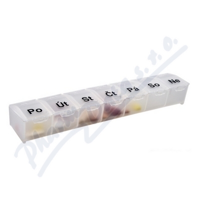 Slouží k přehlednému uspořádání a spolehlivému dávkování léků či potravinových doplňků doma i na cestách. Dostupný v několika barevných provedeních. Velikost dávkovače 140 x 30 x 20 mm (d x š x v).