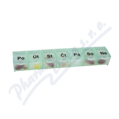 Slouží k přehlednému uspořádání a spolehlivému dávkování léků či potravinových doplňků doma i na cestách. Dostupný v několika barevných provedeních. Velikost dávkovače 140 x 30 x 20 mm (d x š x v).