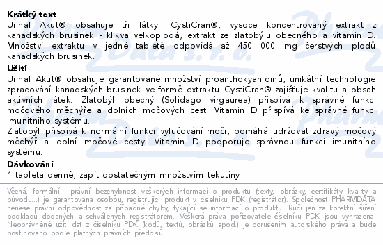 Urinal Akut® obsahuje tři látky: CystiCran®, vysoce koncentrovaný extrakt z kanadských brusinek - klikva velkoplodá, extrakt ze zlatobýlu obecného a vitamin D. Množství extraktu v jedné tabletě odpovídá až 450 000 mg čerstvých plodů kanadských brusinek.