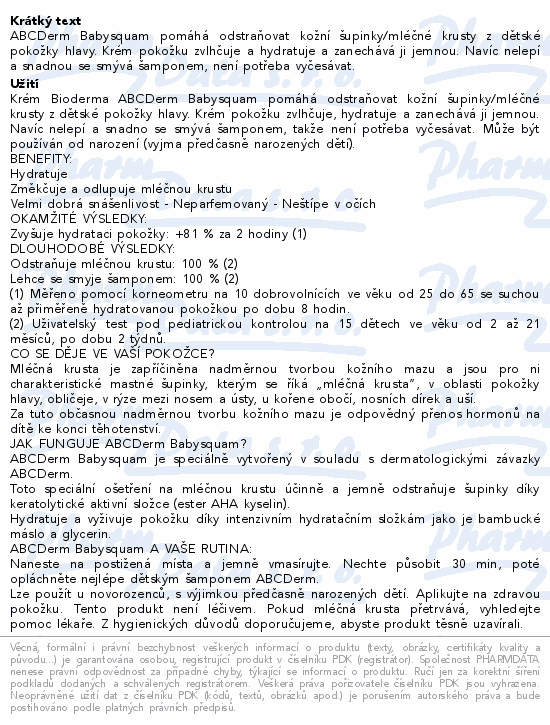 ABCDerm Babysquam pomáhá odstraňovat kožní šupinky/mléčné krusty z dětské pokožky hlavy. Krém pokožku zvlhčuje a hydratuje a zanechává ji jemnou. Navíc nelepí a snadnou se smývá šamponem, není potřeba vyčesávat.