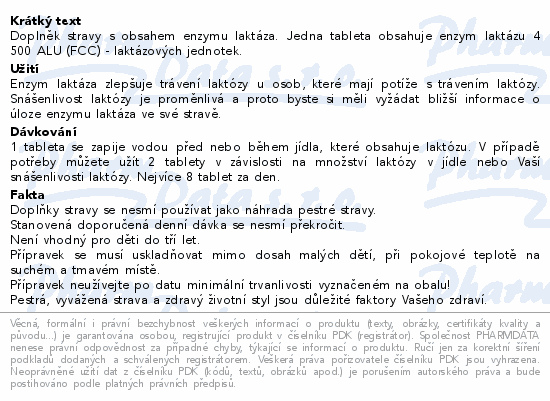 Doplněk stravy s obsahem enzymu laktáza. Jedna tableta obsahuje enzym laktázu 4 500 ALU (FCC) - laktázových jednotek.