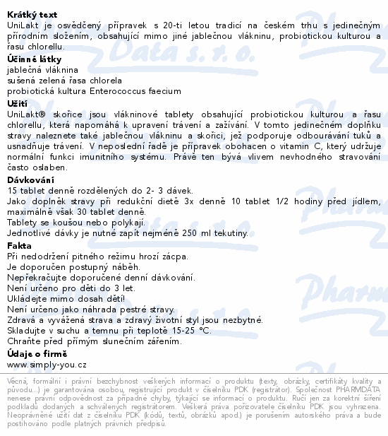 UniLakt je osvědčený přípravek s 20-ti letou tradicí na českém trhu s jedinečným přírodním složením, obsahující mimo jiné jablečnou vlákninu, probiotickou kulturou a řasu chlorellu.