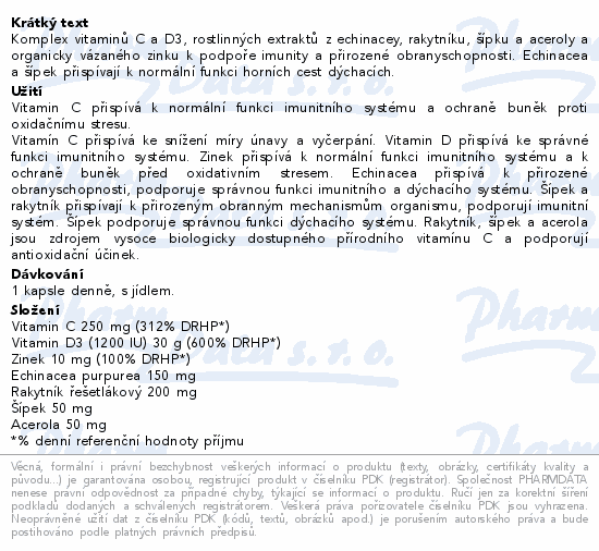 Komplex vitaminů C a D3, rostlinných extraktů z echinacey, rakytníku, šípku a aceroly a organicky vázaného zinku k podpoře imunity a přirozené obranyschopnosti. Echinacea a šípek přispívají k normální funkci horních cest dýchacích.