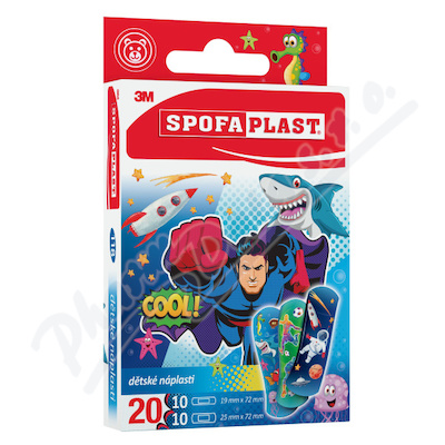 Spofaplast® Dětské náplasti jsou zábavné a tenké náplasti určené na ošetření řezných ran, odřenin a škrábanců dětí. Tyto náplasti vyhovují povrchu pokožky. Jedno balení obsahuje 20 náplastí s různými designy: 10ks - 19x72 mm, 10ks - 25x72 mm.