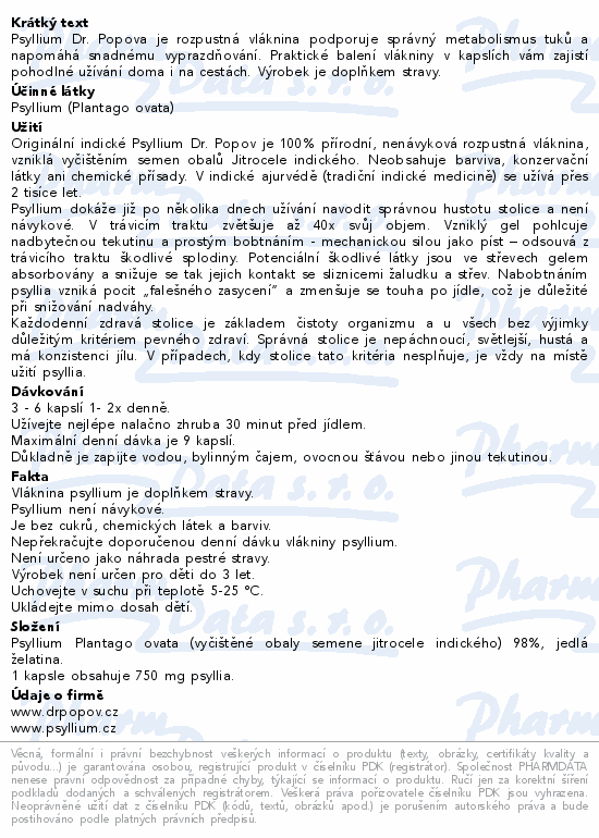 Psyllium Dr. Popova je rozpustná vláknina podporuje správný metabolismus tuků a napomáhá snadnému vyprazdňování. Praktické balení vlákniny v kapslích vám zajistí pohodlné užívání doma i na cestách. Výrobek je doplňkem stravy.