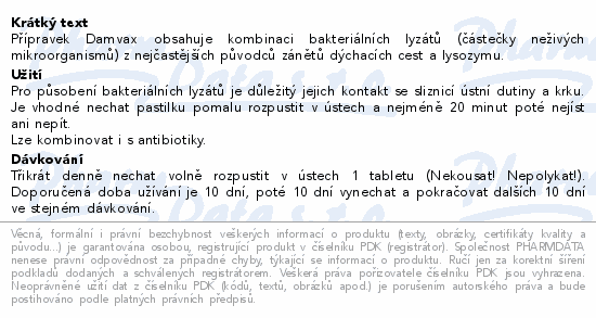 Přípravek Damvax obsahuje kombinaci bakteriálních lyzátů (částečky neživých mikroorganismů) z nejčastějších původců zánětů dýchacích cest a lysozymu.