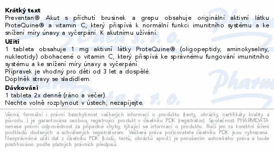 Preventan® Akut s příchutí brusinek a grepu obsahuje originální aktivní látku ProteQuine® a vitamin C, který přispívá k normální funkci imunitního systému a ke snížení míry únavy a vyčerpání. K akutnímu užívání.