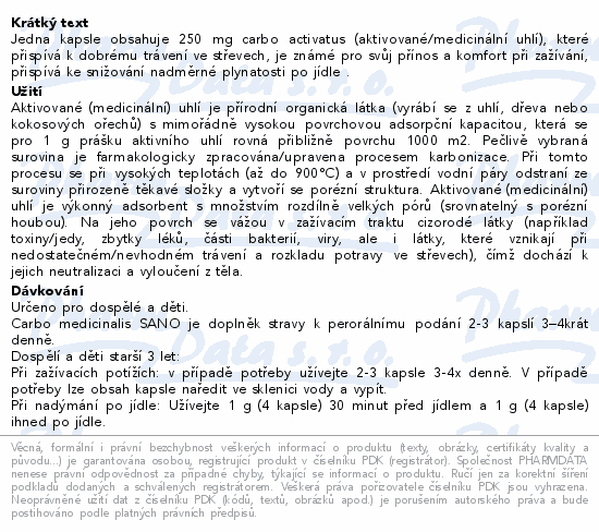 Jedna kapsle obsahuje 250 mg carbo activatus (aktivované/medicinální uhlí), které přispívá k dobrému trávení ve střevech, je známé pro svůj přínos a komfort při zažívání, přispívá ke snižování nadměrné plynatosti po jídle .