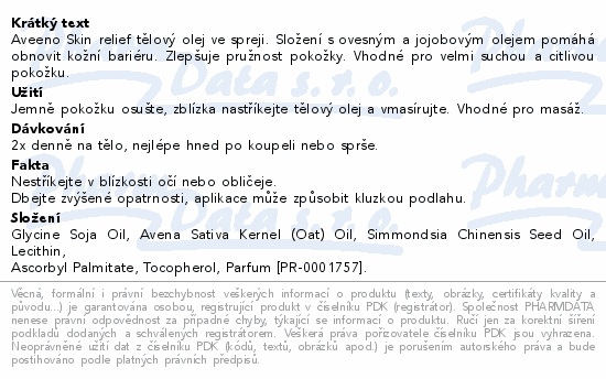 Aveeno Skin relief tělový olej ve spreji. Složení s ovesným a jojobovým olejem pomáhá obnovit kožní bariéru. Zlepšuje pružnost pokožky. Vhodné pro velmi suchou a citlivou pokožku.