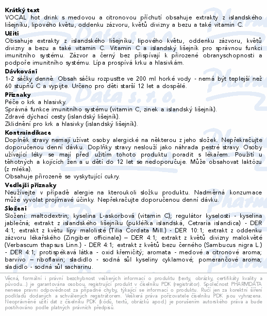VOCAL hot drink s medovou a citronovou příchutí obsahuje extrakty z islandského lišejníku, lipového květu, oddenku zázvoru, květů divizny a bezu a také vitamin C.
