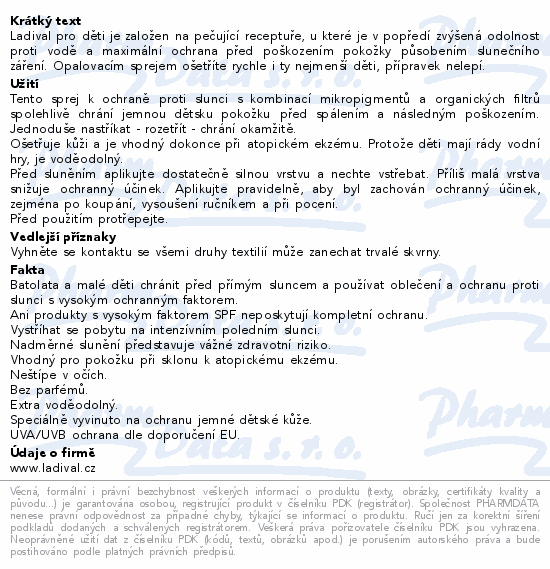 Ladival pro děti je založen na pečující receptuře, u které je v popředí zvýšená odolnost proti vodě a maximální ochrana před poškozením pokožky působením slunečního záření. Opalovacím sprejem ošetříte rychle i ty nejmenší děti, přípravek nelepí.