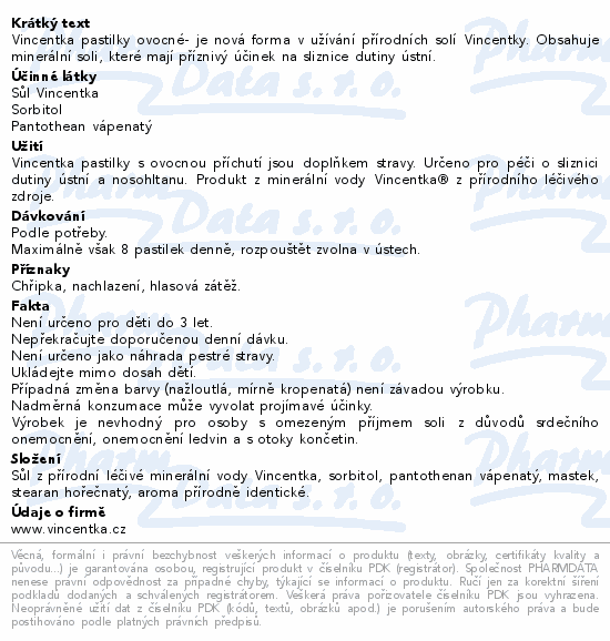 Vincentka pastilky ovocné- je nová forma v užívání přírodních solí Vincentky. Obsahuje minerální soli, které mají příznivý účinek na sliznice dutiny ústní.