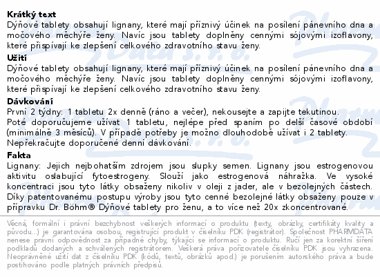 Dýňové tablety obsahují lignany, které mají příznivý účinek na posílení pánevního dna a močového měchýře ženy. Navíc jsou tablety doplněny cennými sójovými izoflavony, které přispívají ke zlepšení celkového zdravotního stavu ženy.